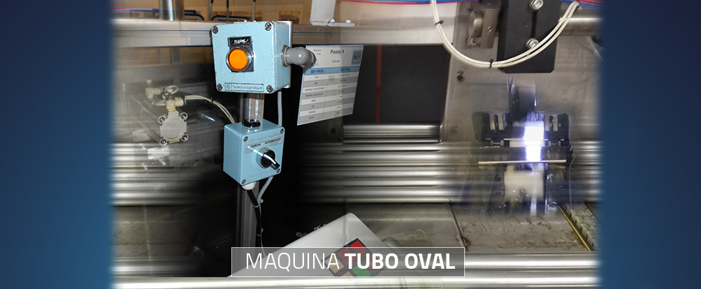 La máquina de tubo oval se encarga de aplanar los tubos y cortarlos en unas dimensiones parametrizadas según la referencia de trabajo. En este proyecto solo se ha reprogramado el ciclo automático de la máquina. La máquina se ha divivido en varias secciones (carga del tubo, conformado, corte y expulsión). En cada sección se a programado un ciclo independiente. La se operación de corte se realiza con un servo que mide la distancia a cortar, definida por la referencia, e introduce el tubo en una guillotina para realizar su corte. La programación se ha realizado en un autómata de Siemens.