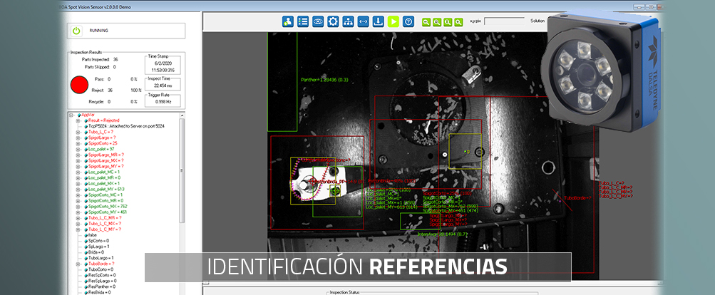 La célula de pasta es cargada de forma manual por los operarios. Los palets donde se cargan las piezas se utilizan para varias referencias. Esta funcionalidad ahorra mucho tiempo al no tener que cambiar los palets por cada tipo de referencia, pero se puede dar la posibilidad de confundirse y manadar al interior de la máquina la pieza incorrecta. Para evitar que el robot pueda colisionar y romper algún elemento, se ha iplementado un sistema de visión para poder identificar la pieza antes de entrar en la máquina. Se ha instalado un sistema de visión basado en cámaras inteligentes Boa Spot. Este sistema toma una foto de la pieza y analiza sus características. Una vez finalizada la inspección, la cámara envía el resultado al PLC. Si la pieza no es la correcta, se para el sistema y se genera una alarma para poder retirar la pieza incorrecta.